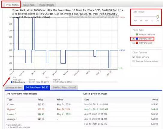 可查到这个产品在历史上所有的价格数据,此案例是从2014年10月23日开始上线,价格是$50,然后又尝试定到$60,经过几次波动,在15年开始至今,价格都相对平稳,都在50的水平。作为新产品,除了参考竞争对手水平,也要自己多番测试,才能找到一个最有利于销量的黄金分割点。Date Range板块有些历史比较旧的listing,由于太多数据,所以当需要时可调成最近6个月的,甚至1个月的,以便得出更详细的数据。默认是历史所有,All。Price Type板块绿色的Amazon,就是Amazon官方销售的产品,极少数的情况可能会需要调查Amazon官方,大部分我们的竞争对手还是第三方卖家居多。蓝色的3rd Party New, 一般默认的都有这个,基本上我们都是第三方卖家。红色的3rd Party Used, 这个基本不用,主要是卖二手货的第三方卖家,基本上只有美国本土才会有人卖二手的,国人的几乎没有,可忽略。所以在下面的三个tab,一般我们默认只有蓝色的3rd Party New.Sales Rank板块