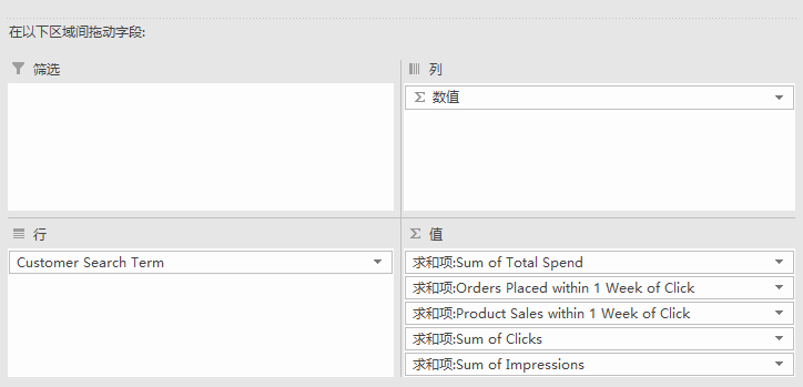 读到这有些人应该会纳闷为何 CTR (Click Through Rate) 等数据没被纳入透视表格里,这是因为手动计算这些数据会比较精准,可以计算好后再增加到表格,BQool 会跟大家解说要如何计算。现在把整理出的数据拖动到如下图示范的位置 (列的数值会自动产生,只要拖动数值到行和值即可) ,透视表就会自动成型。