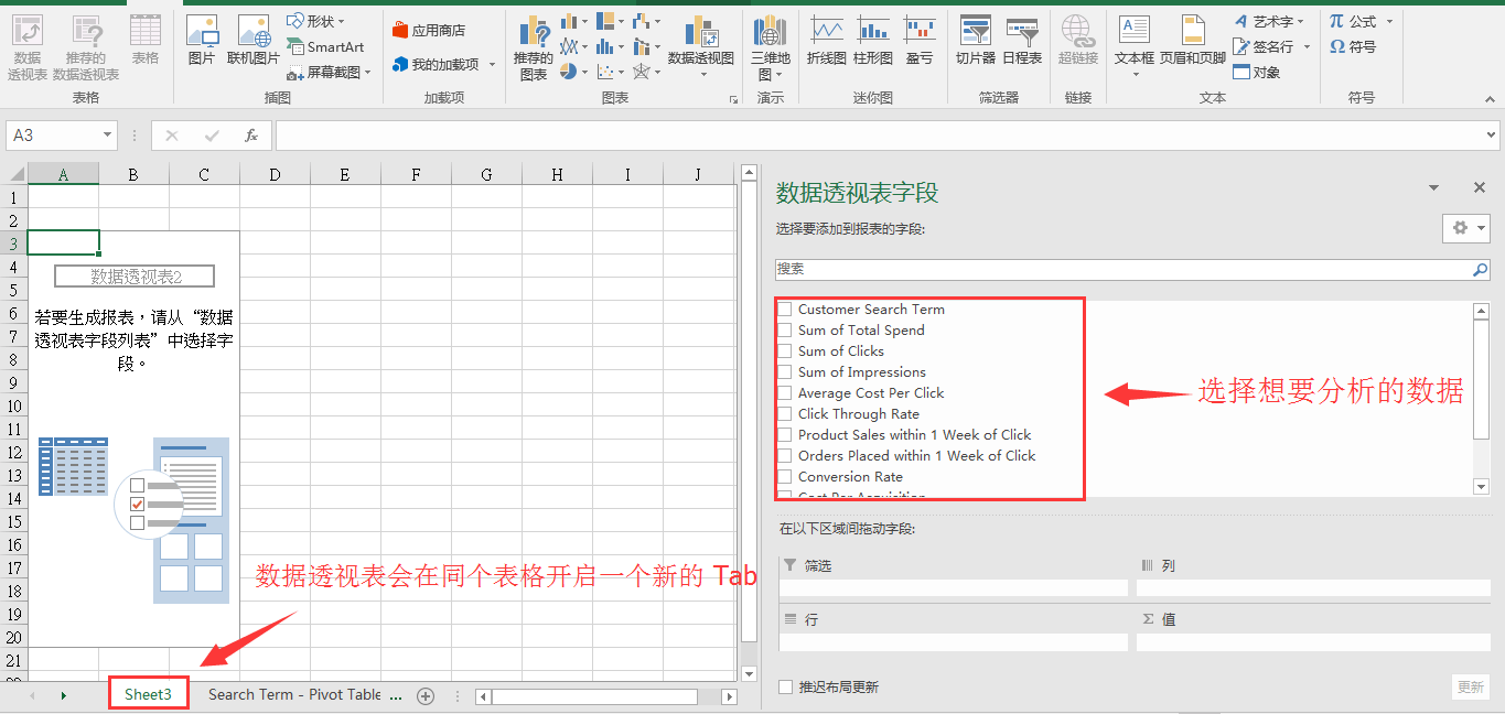 数据透视表会新增一页,现在您可以开始从透视表中选择新表格要分析哪些数据