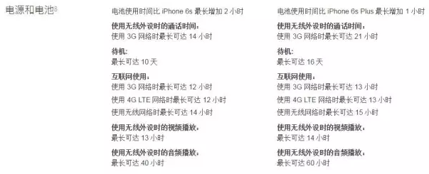 电池续航上,iPhone 7电池使用时间比 iPhone 6s 最长增加 2 小时;iPhone 7 PLUS电池使用时间比 iPhone 6s Plus 最长增加 1 小时
