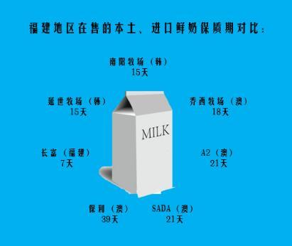 福建地区在售的本土、进口巴氏鲜奶保质期对比,来自澳洲的巴氏鲜奶保质期都在30天以上,其中保利巴氏杀菌乳保质期为将近40天。而本土巴氏鲜奶保质期仅为7天。