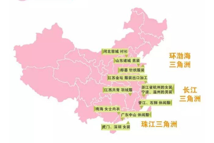 以长江三角洲、珠江三角洲、环渤海三角洲三大经济圈为辐射中心,在服装主产区广东省、浙江省、江苏省、山东省、福建省等地,都有形成了以生产某类产品为主的区域产业集群。