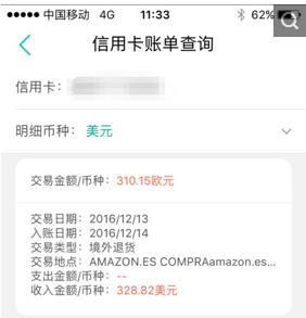 12月15日中午掌上银行查询到310.15欧元的境外退货款项已到账。