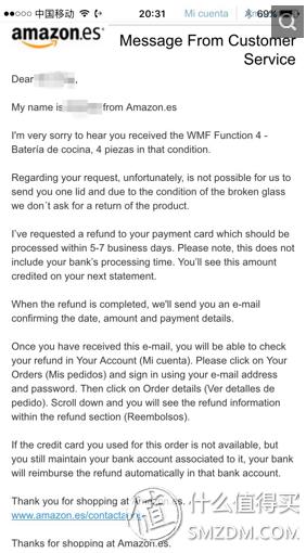其中第一封客服人员以英文回复,大意是很遗憾商品出了状况,不能补寄锅盖,但申请了退款,退款金额后续发送通知,预计5-7个工作日返还至信用卡,在”我的订单“的详细信息栏中可查阅退款信息。