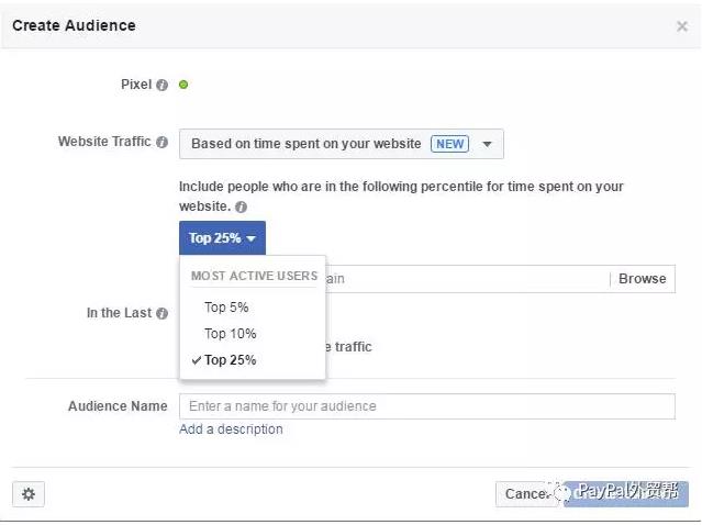 ③点击Website Traffic下拉列表,在底部,你会看到选项“根据用户在你网站上花费的时间”。在下拉选项中,包括了在过去180天内访问你网站的前5%、10%或25%的活跃用户(如下图):