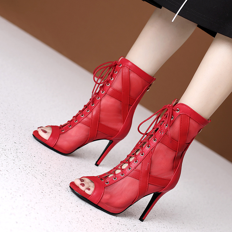 短靴系带爵士舞跳舞高跟凉鞋细跟网纱牛皮凉靴女鱼嘴